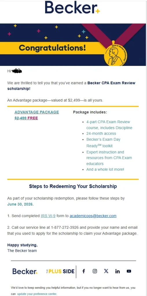 I received an official email from Becker saying I was selected for the Newt Becker Scholarship. Based on that, I submitted a W-9 form, which includes my Social Security Number.