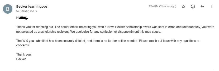 Brutal. The reader’s first instinct seeing this is *scam!* but honestly, that would be a pretty advanced scam to impersonate Becker and send out emails on the actual day applicants were expecting to hear back about the scholarship just to get someone’s SSN. It wasn’t a scam, Becker confirmed as much: