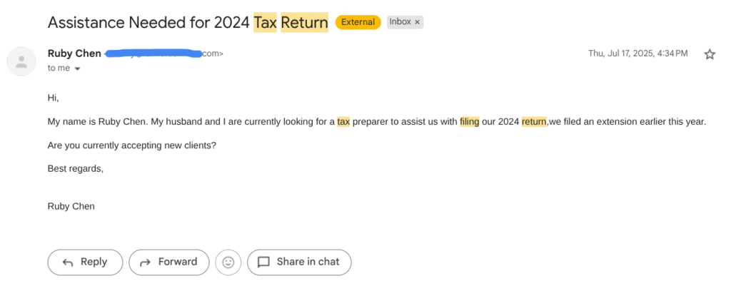 That one was pretty basic and we can only tell it’s a scammer because who the hell would ask an accounting tabloid to do their taxes? Plus the email didn’t match the name. We’ve also gotten a bunch of these with attachments, those tend to come with more scammer tells than the above.